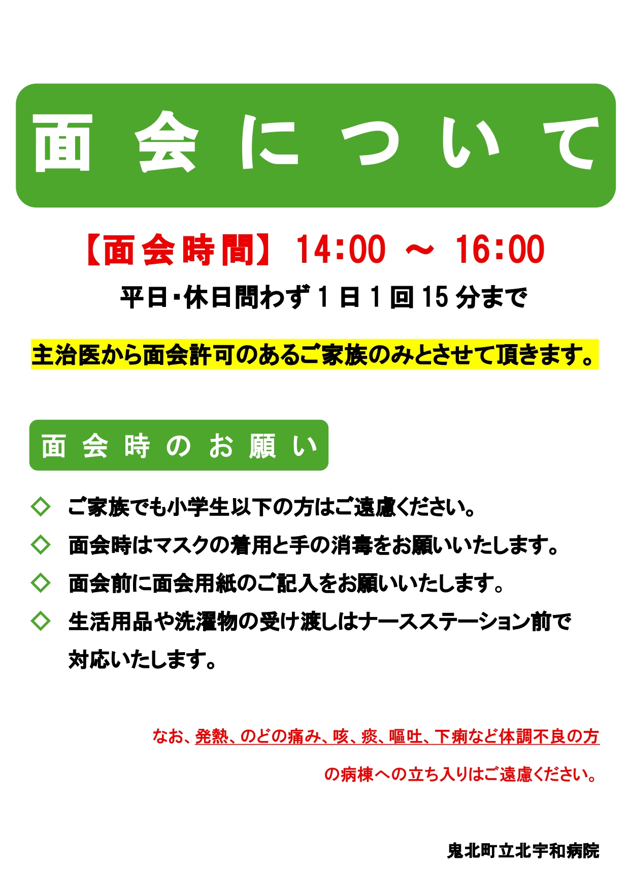 ホーム お知らせ一覧 一般 面会について 2025.12.12 一般 面会について 一般 患者さん その他 【午前】8:30〜11:30 【午後】14:00〜16:00 ※診療科により診療を行っていない時間帯があります。予めご確認ください。 【午後】13:00〜20:00 ※休診:土曜、日曜、祝日、年末年始 外来担当表 診療科目のご案内 病棟のご案内
